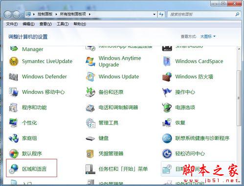 在“控制面板”下打开“所有控制面板项”,找到“区域和语言”