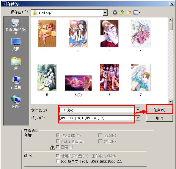 7、弹出保存窗口,在红框里面,修改文件名和选择保存模式jpg,点击”保存“即可。