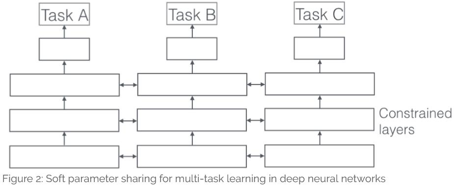 (1)参数的硬共享机制:参数的硬共享机制是神经网络的多任务学习中最常见的一种方式,这一点可以追溯到文献[2]。一般来讲,它可以应用到所有任务的所有隐层上,而保留任务相关的输出层。硬共享机制降低了过拟合的风险。事实上,文献[3]证明了这些共享参数过拟合风险的阶数是N,其中N为任务的数量,比任务相关参数的过拟合风险要小。直观来将,这一点是非常有意义的。越多任务同时学习,我们的模型就能捕捉到越多任务的同一个表示,从而导致在我们原始任务上的过拟合风险越小。