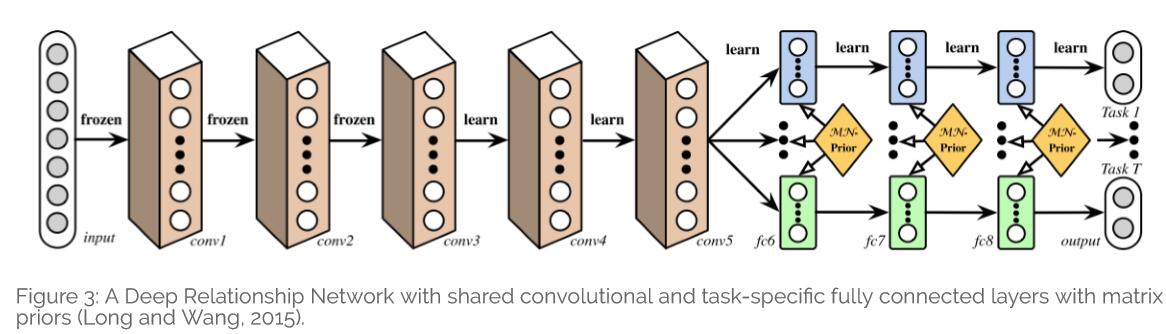 在用于机器视觉的多任务场景中,已有的这些方法通常共享卷积层,将全链接层视为任务相关的。文献[34]提出了深度关系网络。除了共享层与任务相关层的结构,他们对全连接层添加矩阵先验。这将允许模型学习任务间的关系。这一点与我们之前看过的贝叶斯方法是类似的。然而,问题是这个方法依然依赖于事先预定义的共享结构。这一点对于机器视觉问题已经足够,但是对于新任务有错误倾向。