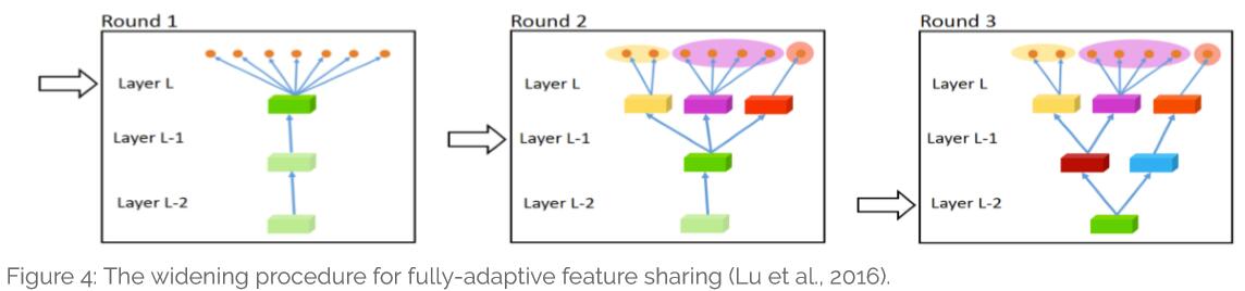 从另一个极端说起,文献[35]提出了一个自底向上的方法。从瘦网络(thin network)开始,使用对相似任务自动分组的指标,贪心的动态加宽网络。这个加宽的过程动态创建分支,如图4所示。然而这种贪心的做法并不能得到全局的最优。为每个分支分配精确的一个任务,并不能允许模型学到更复杂的任务间的交互。