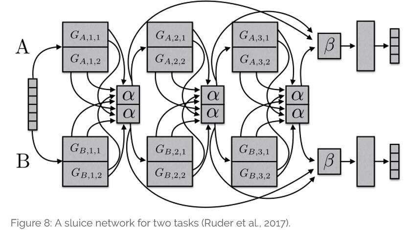 最后我们说一下文献[41]中提到的水闸网络,它是对多种基于深度神经网络的多任务学习方法的泛化。如图8所示,这个模型可以学习到每层中哪些子空间是必须共享的,以及哪些是用来学习到输入序列的一个好的表示的。