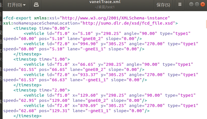 仿真成功后会生成一个车辆跟踪文件vanetTrace.xml,内容格式如下: