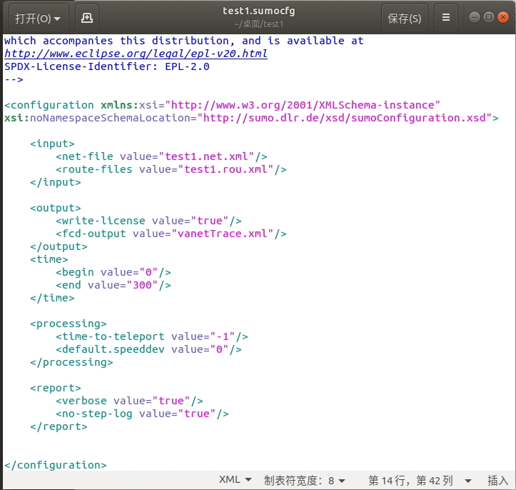 1.利用sumo搭建一条直行道路,其中test1.sumocfg配置文件如下所示: