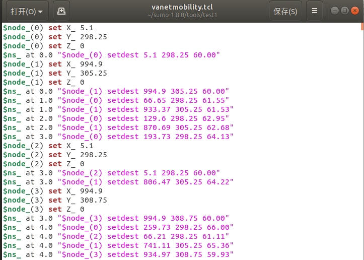 命令成功运行后,会生成一个vanetmobility.tcl文件(该文件可被ns3读取) ,其格式如下图所示: