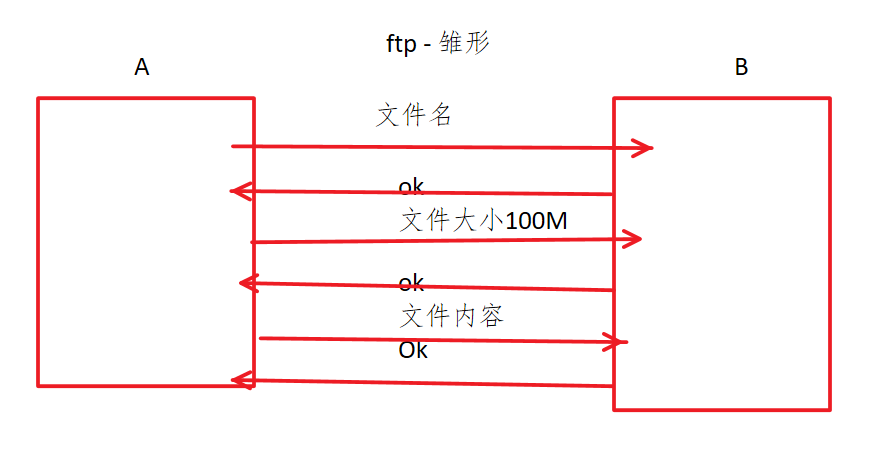 最初的ftp工作原理如上图,A主机发送文件名给B主机,B主机接收到文件名之后返回给A确认的信号,之后A主机发送文件大小信息给B主机,B主机接收到信息之后又返回给A主机…这种工作模式效率比较低,而且如果丢失了其中任何一个步骤,需要重新从头再来,后来人们就采用了如下协议,也就是数据包的格式: