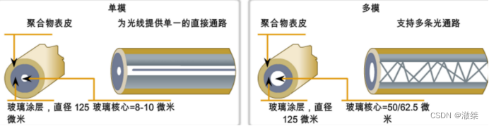 单模:应用于注入式激光二极管,光在光纤中横向(直线)传输