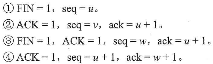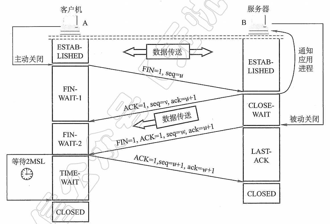 第四步:客户机收到连接释放报文段后,必须发出确认。在确认报文段中,ACK字段被置为1,确认号ack=w+1,序号scq=u+1。此时TCP连接还未释放,必须经过时间等待计时器设置的时间2MSL后,A才进入连接关闭状态。