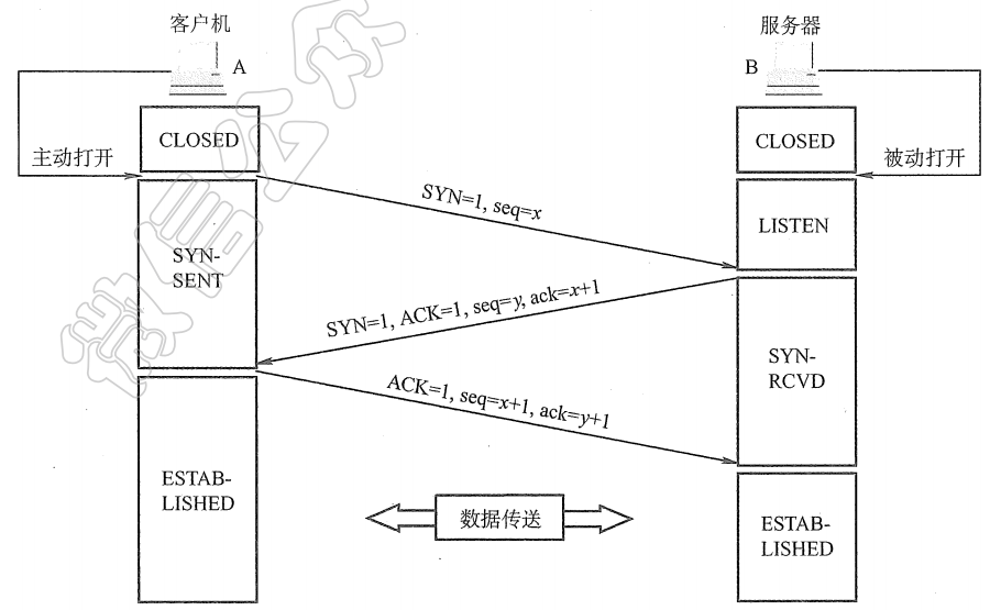 TCP连接的建立采用客户机/服务器方式。主动发起连接建立的应用进程称为客户机(Client),而被动等待连接建立的应用进程称为服务器( Server)。