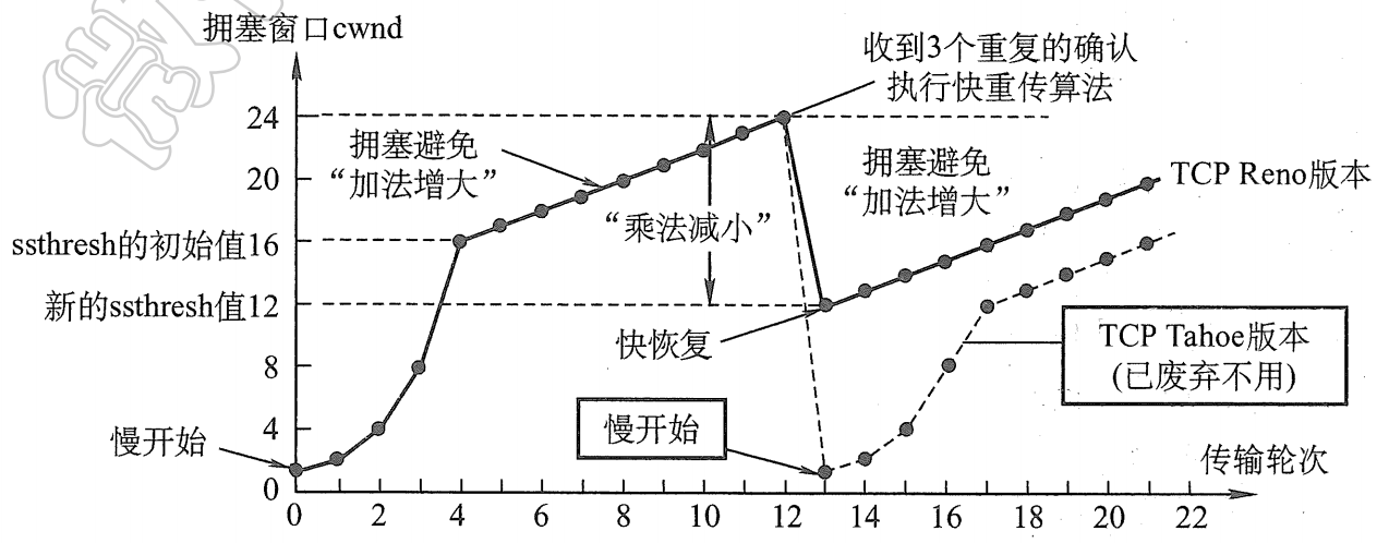 - 假定cwnd=24时网络发生拥塞,更新ssthresh的值为12(即变为超时时cwnd值24的一半),cwnd 重置1,并执行慢开始算法,cwnd=12时,改为拥塞避免算法。
