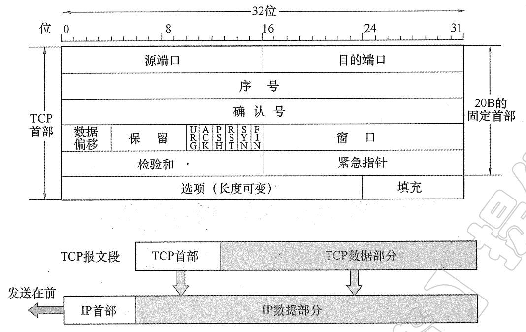整个TCP报文段作为IP数据报的数据部分封装在IP数据报中,如下图所示。