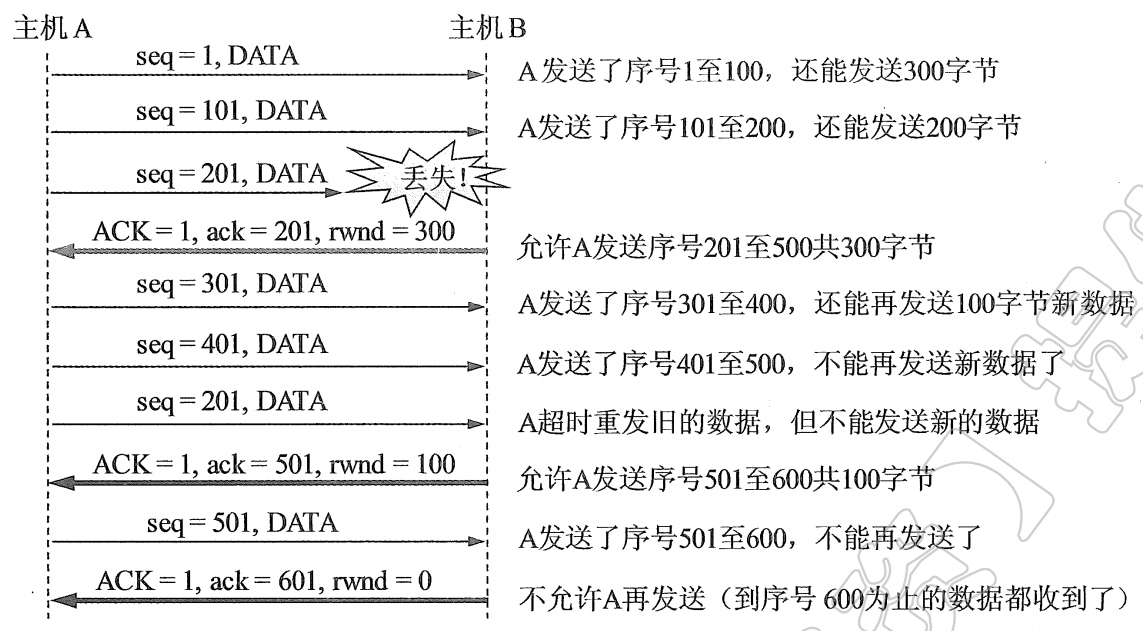 下图中的例子说明了如何利用滑动窗口机制进行流量控制。设主机A向主机B发送数据,在连接建立时,B告诉A:“我的接收窗口rwnd = 400 (字节)”。