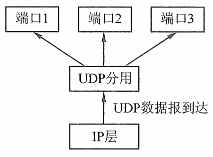当传输层从IP层收到UDP数据报时,就根据首部中的目的端口,把UDP数据报通过相应的端口上交给应用进程,如下图所示。