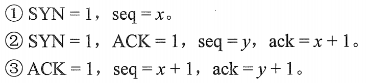 第三步:当客户机收到确认报文段后,还要向服务器给出确认,并且也要给该连接分配缓存和变量。这个报文段的ACK标志位被置1,序号字段为x+1,确认号字段ack=y+1。该报文段可以携带数据,若不携带数据则不消耗序号。