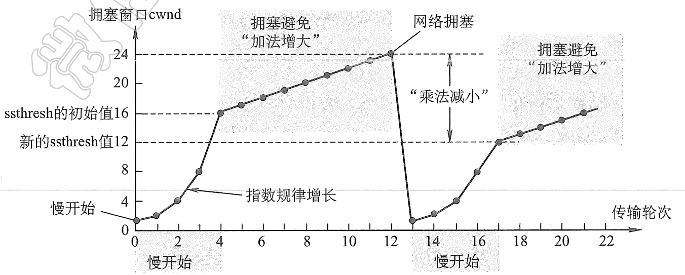 - 拥塞窗口cwnd增长到慢开始门限ssthresh时(即当cwnd=16时),就改用拥塞避免算法,cwnd按线性规律加性增长。