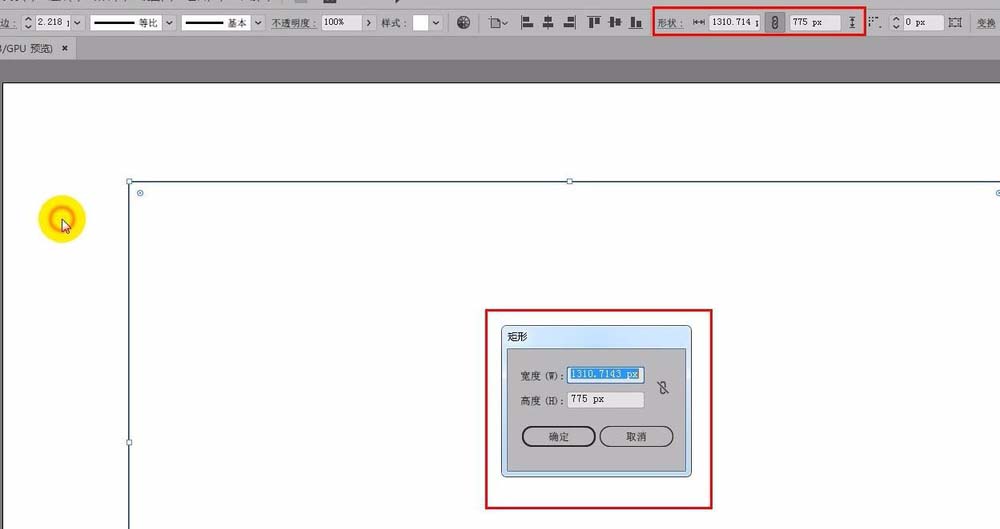 1、打开软件,用矩形工具,在页面画一个矩形,我们要在这个矩形内做渐变的效果。矩形可以可以直接在工作区拖动出来,然后更改宽和高的数值,选择矩形工具后,在工作区点击一下,弹出矩形对话框,输入宽和高的数值创建