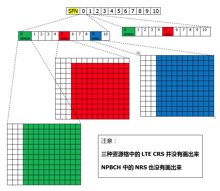 1.左图 图中黑色部分为CRS的位置,灰色部分为NPSS位置。值得注意的是,传输NPSS的5号子帧上没有NRS窄带参考信号。另外如果在带内组网模式下与CRS(小区参考信号)重叠,重叠部分不计作NPSS,但是仍然作为NPSS符号的一个占位匹配项;