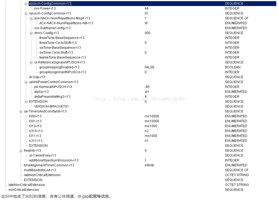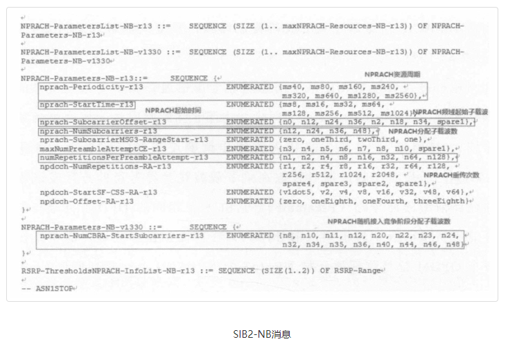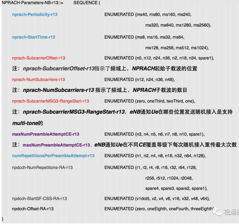 “nprach-Periodicity-r13”,“nprach-StartTime-r13”,“numRepetitionsPerPreambleAttempt-r13”, 指示了 NPRACH 时域上的位置。 而“nprach-SubcarrierOffset-r13”,“nprach-NumSubcarriers-r13 ”,指示了 NPRACH 频域上的 位置,同时“nprach-SubcarrierMSG3-RangeStart-r13”指示在频域什么位置上发送指示 Ue 支持 Multi-tone 的 RRC Connection Request。