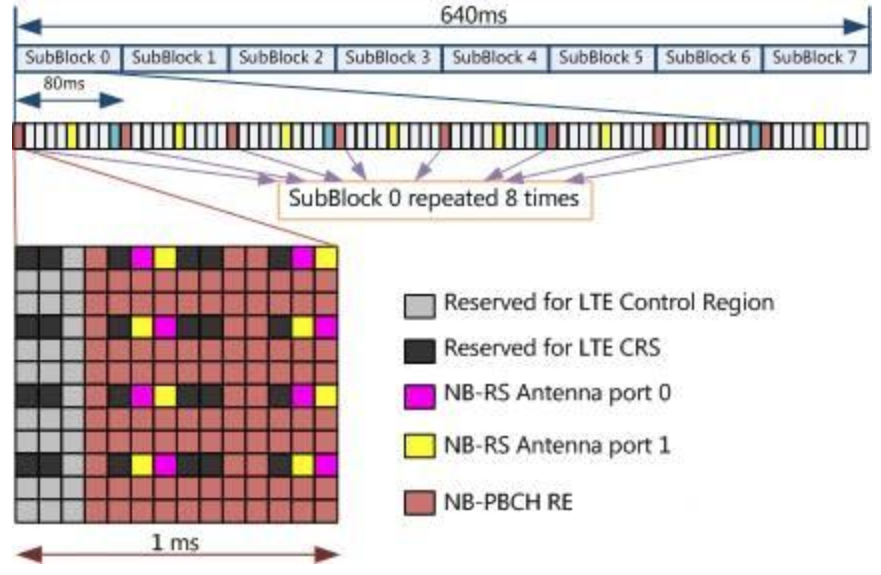 NPBCH以64个无线帧为循环,在mod 64=0的无线帧上的0号子帧进行传输,同样的内容在接下来连续的7个无线帧中的0号子帧进行重复传输,NPBCH不可占用0号子帧的前三个OFDM符号,以避免与LTE大网的CRS以及物理控制信道的碰撞。根据3GPP 36.211R13定义,一个小区的NPBCH需要传输1600bit,采取QPSK调制,映射成800个调制符号,而每8个无线帧重复传输,64个无线帧将这800个调制符号传完,意味着每8个无线帧重复传输100个调制符号,那么在这8个无线帧的每个0号子帧中需要传输这100个调制符号。这里进行一个简单的计算,一个NB-IoT子帧包含12X7X2=168个RE,去掉前三个OFDM符号,去掉NRS占用的RE,再去掉CRS占用的RE(假设为双端口发射),那么一共有168-12×3-4×4-4×2=100个RE,恰好对应100个QPSK调制符号,因此每个无线帧上的0号子帧恰好装满了NPBCH的符号。