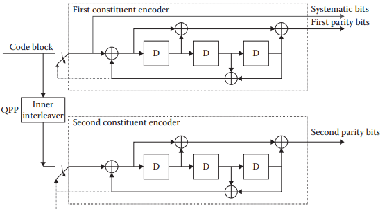 turbo编码器是并行级联卷积码(PCCC),具有两个八态成分编码器和一个turbo码内部交织器。 turbo编码器的编码率是1/3。 turbo编码器如图7.27所示。