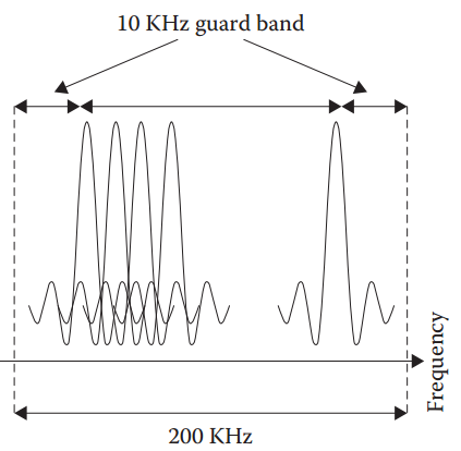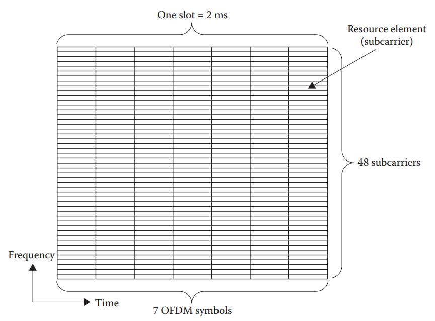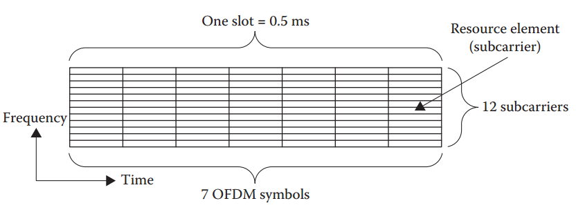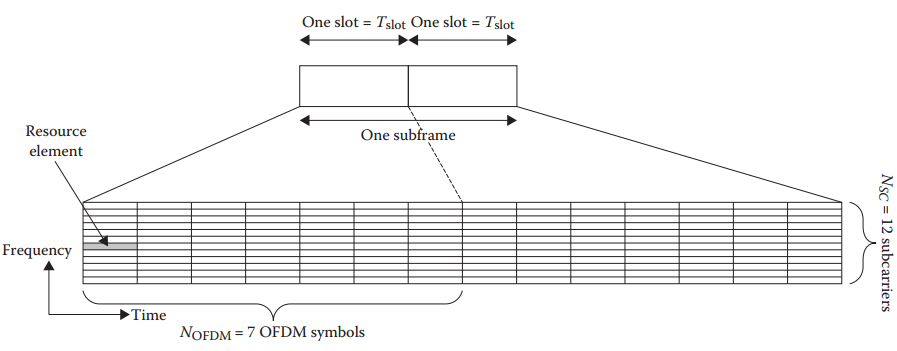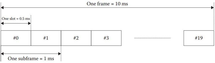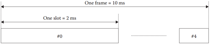 上行链路帧结构与图7.2中的相同,持续时间为10ms,如果Δf= 15KHz,则为20个时隙。如果Δf= 3:75 KHz,则帧持续时间为10 ms,仅有5个时隙(时隙为2 ms),如图7.3所示,其中时隙边界与图7.2中的子帧边界相同。