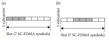 图7.33:子载波间隔为(a)3.75 KHz和(b)15 KHz时NPUSCH格式1的DMRS。
