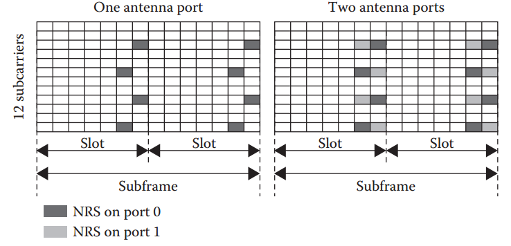 图7.34:子载波间隔为(a)3.75 KHz和(b)15 KHz时NPUSCH格式2的DMRS。