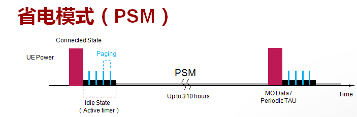 PSM(Power Saving Mode) 的技术原理非常简单,在PSM该状态下,终端射频关闭,相当于关机状态,终端非业务期间深度休眠,不接收下行数据,只有 终端主动发送上行数据(MO Data)时可接收IoT平台缓存的下行数据。