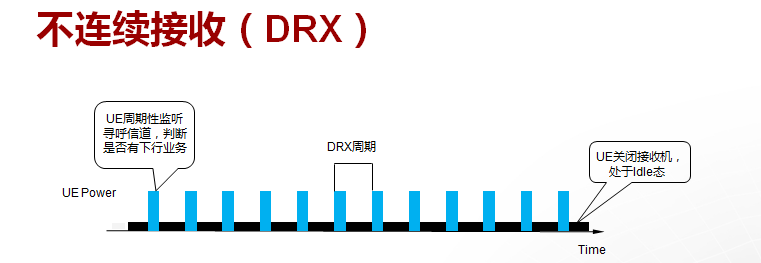 DRX(Discontinuous Reception)即非连续接收,是指终端仅在必要的时间段打开接收机进入激活态,用以接收下行数据,而在剩余时间段关闭接收机进入休眠态,停止接收下行数据的一种节省终端电力消耗的工作模式。
