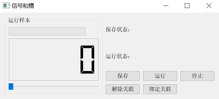 程序样本运行的界面逻辑,先设定运行的程序样本数量,然后先保存后运行的逻辑状态。通过slider的滑动来改变progressBar和LCD的显示数据;“保存”按钮保存运行的样本;“运行”按钮运行程序样本;“解除关联”解除slider.valueChanged信号的绑定,此时slider的滑动,不会改变progressBar和LCD的显示。