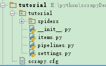 scrapy.cfg: 项目的配置文件。tutorial/: 该项目的python模块。之后您将在此加入代码。tutorial/items.py: 项目中的item文件。tutorial/pipelines.py: 项目中的pipelines文件。tutorial/settings.py: 项目的设置文件。tutorial/spiders/: 放置spider代码的目录。
