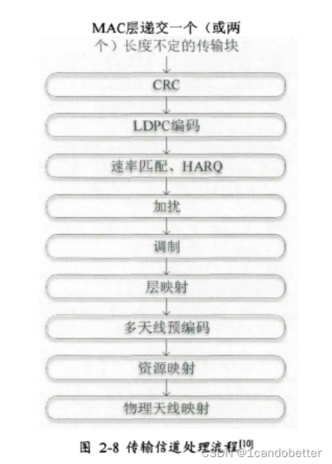 在每个TTI (传输时间间隔),MAC层通常传递一个传输块给物理层,到达物理层后会给传输块添加一个CRC (循环冗余校验)用于接收端检测传输错误。再把添加CRC后的比特进行LDPC(低密度奇偶校验)编码,然后为了适配物理资源进行速率匹配以及根据HARQ调整发送比特,主要是根据传输序号对应的冗余版本选择传输比特在环形缓冲区的起始位置。确定好传输的比特后再经过加扰、调制、层映射、预编码、资源映射、天线映射等一系列操作到达空口,通过空口传给用户终端。