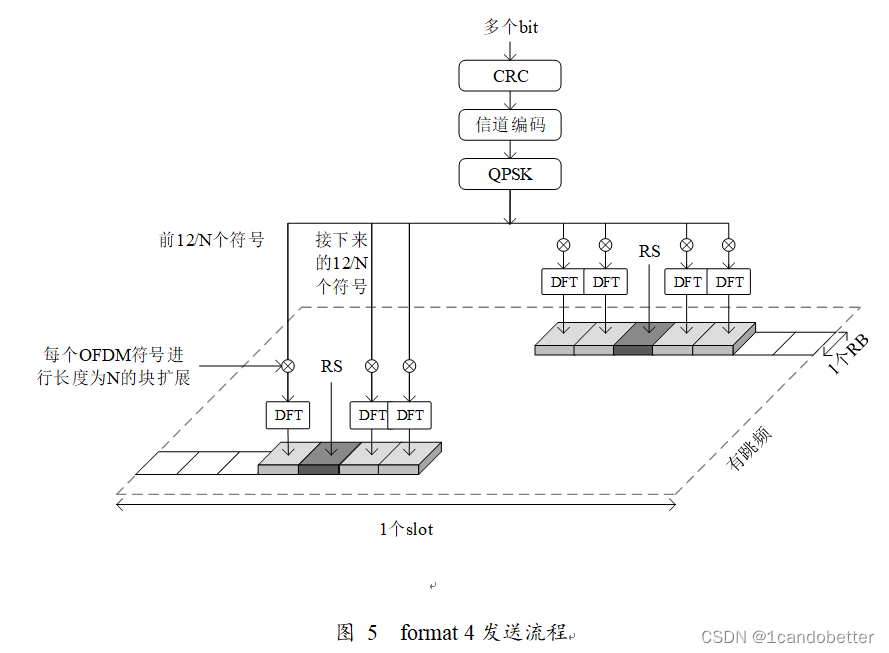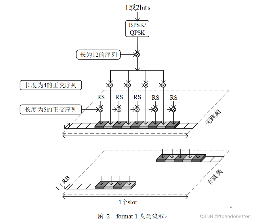 最后在标准中确定的format 1是大致一半符号承载RS。1比特信息时使用BPSK (Binary Phase Shift Keying,二进制相移键控)调制,2比特使用QPSK (Quadrature Phase Shift Keying,四进制相移键控)调制,调制后是一个复数符号,然后与一个长为12的低PAPR序列相乘,序列类似于format 0使用的序列。接下来会使用一个长为信息占用符号长度的正交序列进行时域块扩展,扩展后的信息符号映射到信息对应的OFDM符号上即可。