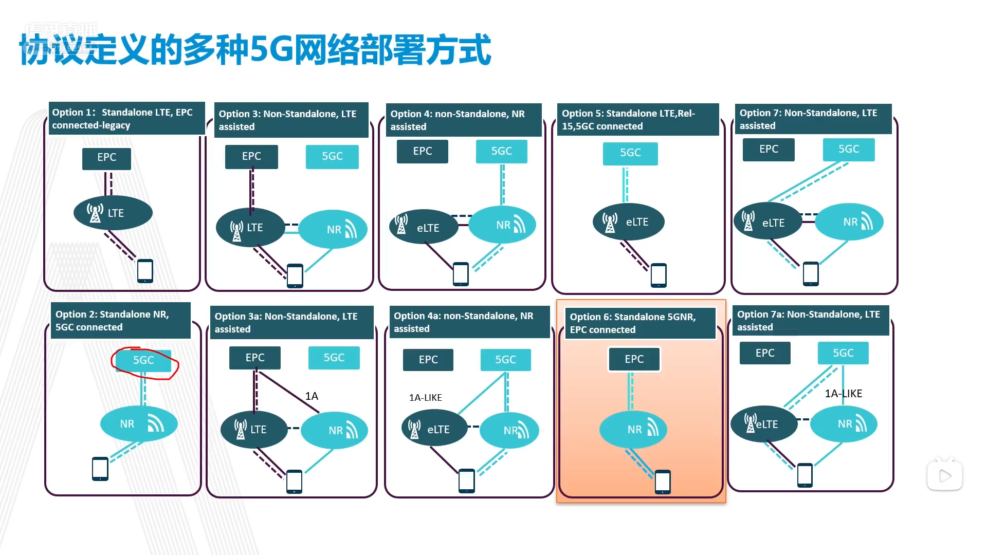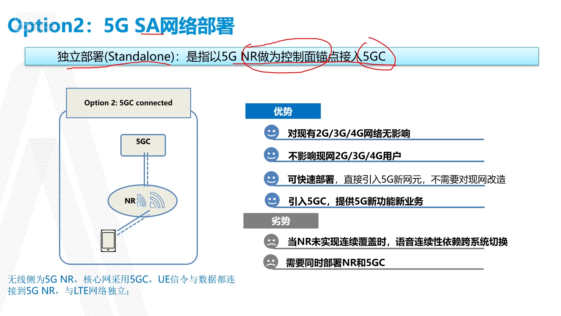 独立部署(SA):整个网络架构都是 5G 部分,没有 LTE 参与网络架构的建设