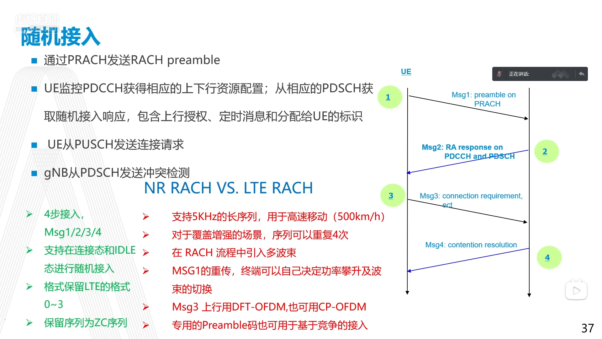 通过 PRACH 信道发送随机接入请求 --> 获得随机接入响应(包含上行授权、定时消息和标识)--> 发送竞争请求 --> 请求通过