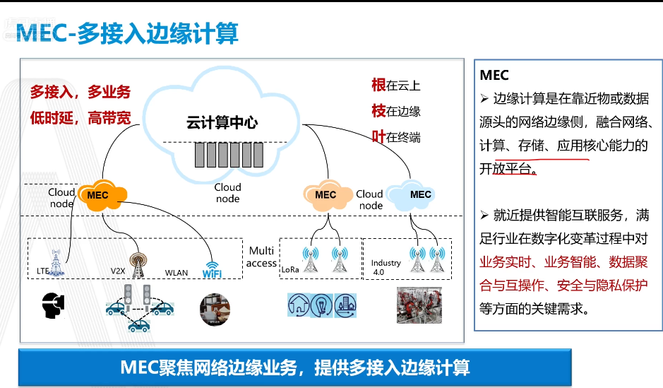 通过多接入边缘计算,可以将把数据中心放到靠近基站的地方,降低了时延