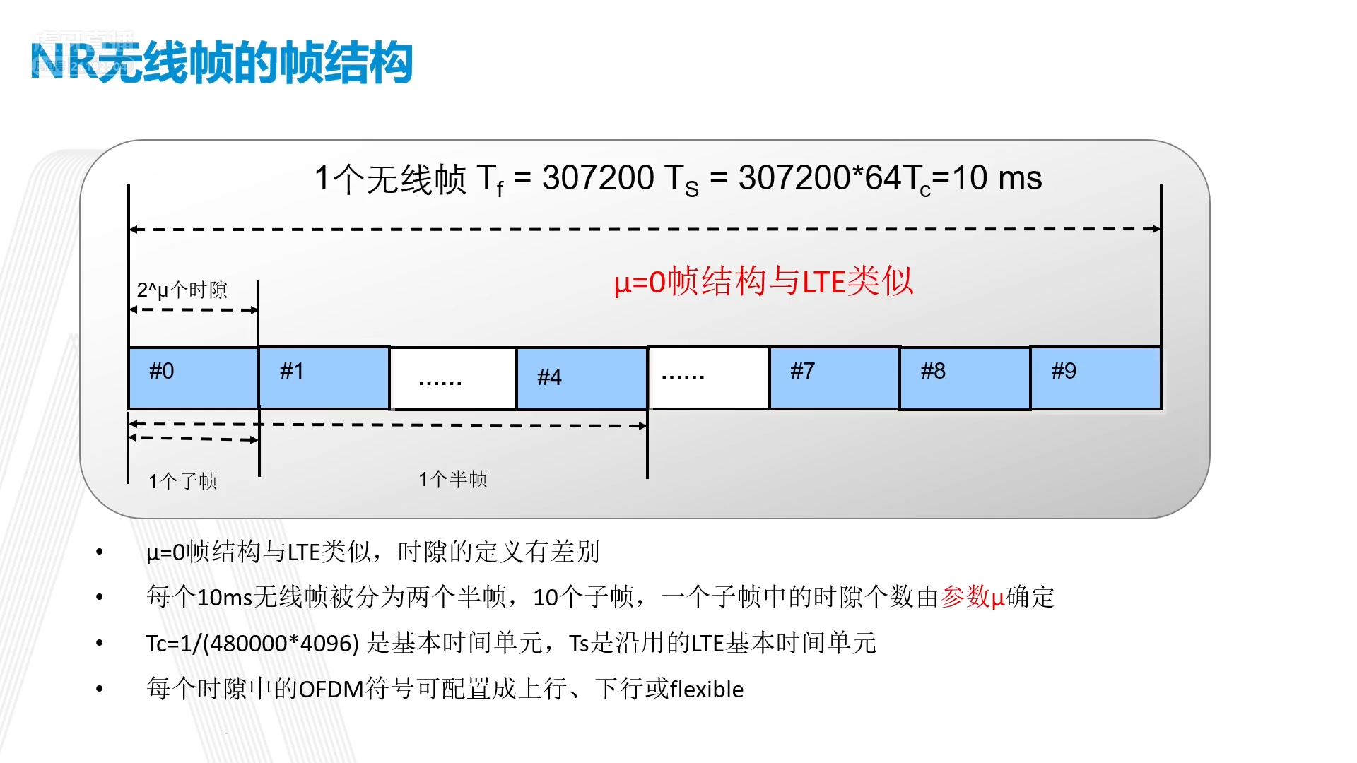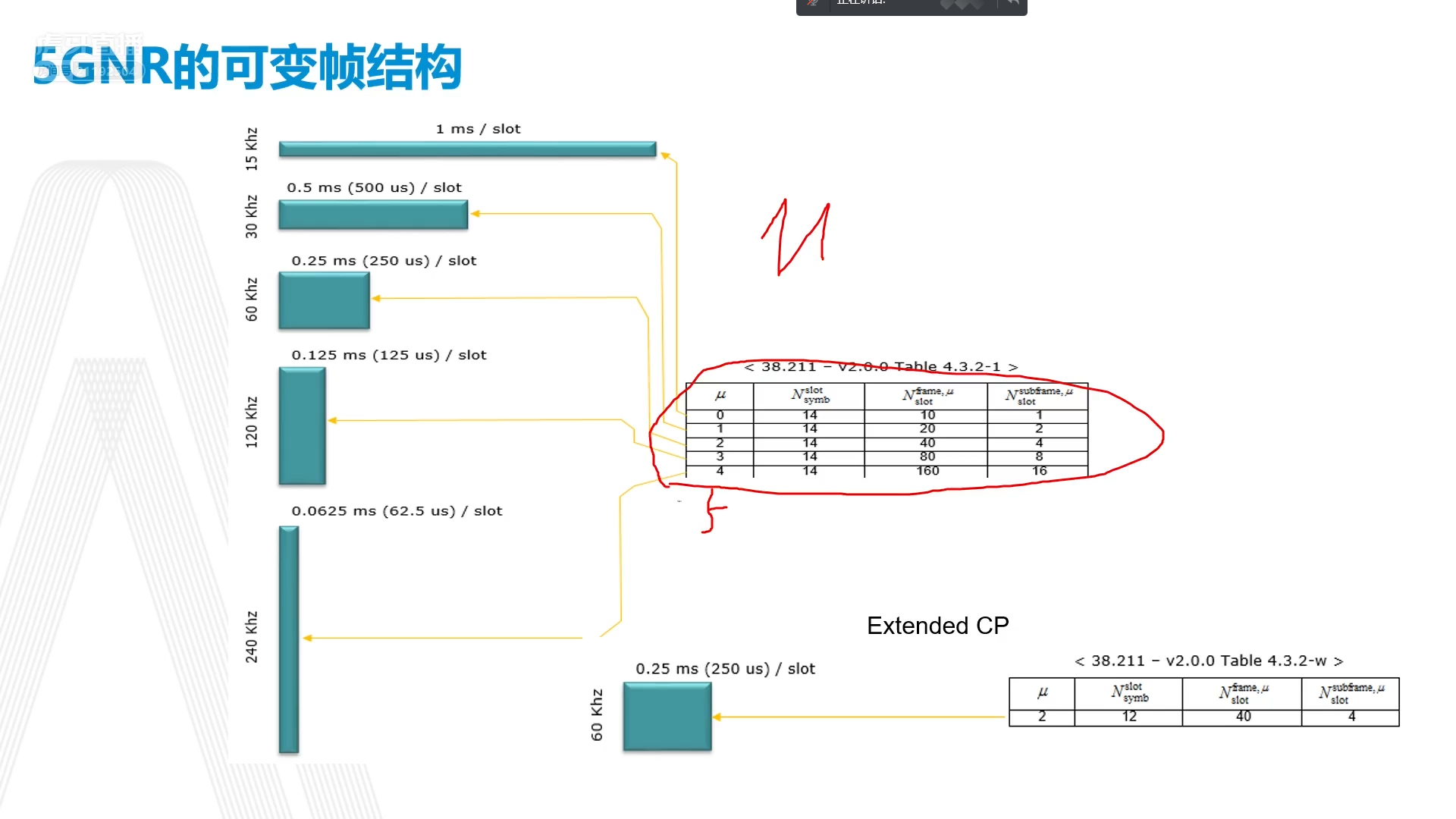 u 可以取 0,1,2,3,4,也可以取5,当 u 取 5 时代表子载波间隔为 480k, 商用的 u 采用小于 5 的部分,u 用来判断一个子帧中的时隙个数; lte 中的一个子帧存在两个时隙.