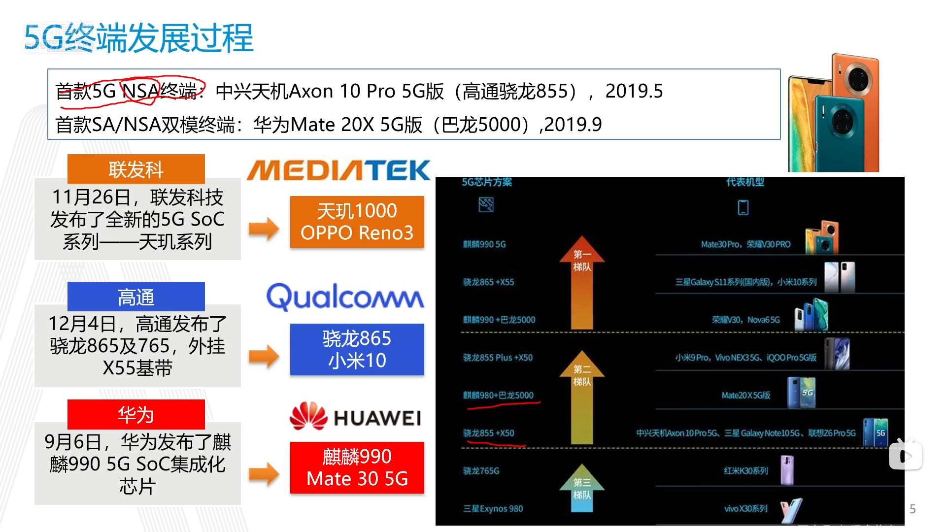 首款 5G SA/NSA (双模)终端 :2019.09 华为Mate 20X 5G版 巴龙5000芯片