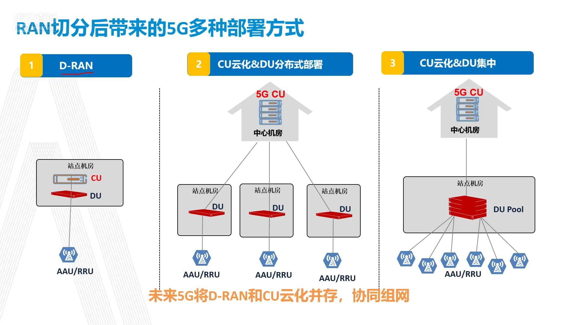 D - RAN:分布式无线网络,一个站点机房中有 CU 和 DU 两个部分