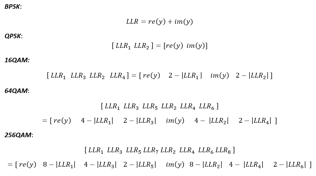 解调通用的算法是利用基于最大后验概率准则的对数似然比(LLR, log likelihood ratio)来计算调制信号的软比特信息。