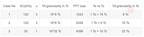 在5G中,N_TA的单位变为 Tc,计算公式改为N_TA = TA* 16*64* Tc /2^u。与LTE的16 Ts 不同, NR TA的颗粒度随着子载波间隔和系统带宽变化。 系统带宽可以有FFT尺寸来表征。