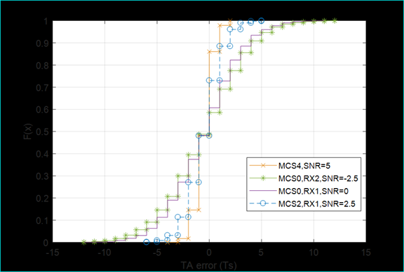 频域检测:时域上的时间变化在频域上对应着相位旋转。因此,在全频带上,对相邻的参考信号估计出相位差,两两估计出一个,然后再对所有的相位差取平均,得到TA值。频域的方法不需要进行IFFT变换,复杂度更小一些。但是性能很大程度上依赖信道估计的结果。信道初步估计时,通常会采用LS的方法,这种方法在低信噪比时性能较差,因此频域检测的方法,如下图所示,在低信噪比时的TA估计结果误差会比较大。