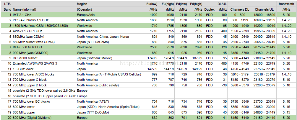 有时候我们在看资料文档的时候,会发现存在“频带是850M”、"DCS1800频带"这类说法,这种说法是业内的俗称,并不是一种正式的叫法,它们所指代的频率范围不要与图1中的频带范围相联系。比如“850M频带”一般指代的就是Band5,但从图1中可以看到,Band5的频率范围并不包含850MHz在内。LTE协议规定的频带与通俗叫法的对应关系如下图所示。