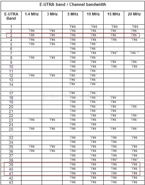 3GPP也规定了不同频带中可以使用的带宽类型,如下表所示。对于目前中移动、联通、电信使用的TDD频带39、40、41来说,支持的带宽是5MHz、10MHz、15MHz和20MHz。