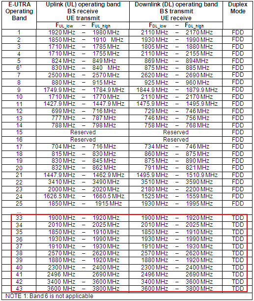 协议36101规定了目前LTE所有的频带、该频带的频率范围和LTE制式,如下图所示。需要注意的是,频带1-32的上下行频率范围是不重叠的,即上行和下行在不同的频点中传输数据,这种频带也称为“成对频带”(Paired Frequency Band),预留给FDD使用。频带33-43的上下行频率范围一致,这种频带也称为“非成对频带”(Unpaired Frequency Band),预留给TDD使用。