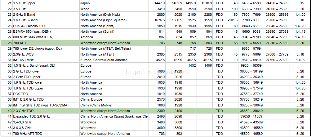 所谓频带,指代的是一个频率的范围或者频谱的宽度,即无线解码器的最低工作频率至最高工作频率之间的范围,单位是Hz。为了方便起见,在LTE中,使用数字1-43来表示不同的频带(36101-V10.21.0版本协议),从而指代不同的频率范围。