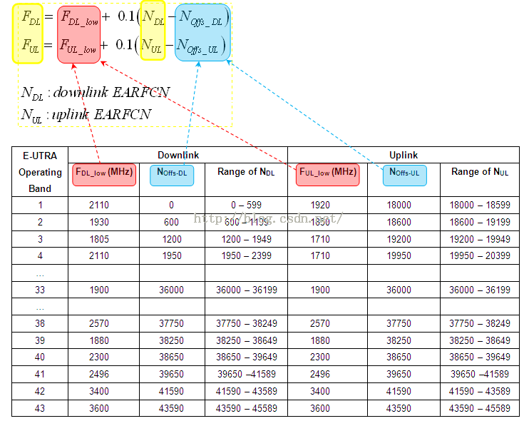 通过上图可以看出,通过频带Band、信道带宽Bandwidth和载波频率Fc这三个值,就可以唯一确定LTE系统的具体频率范围了。由于载波频率Fc是一个浮点值,与整形类型相比,不好用于空口的传输,因此在协议制定的时候,使用载波频点号来表示对应的载波频率Fc。
