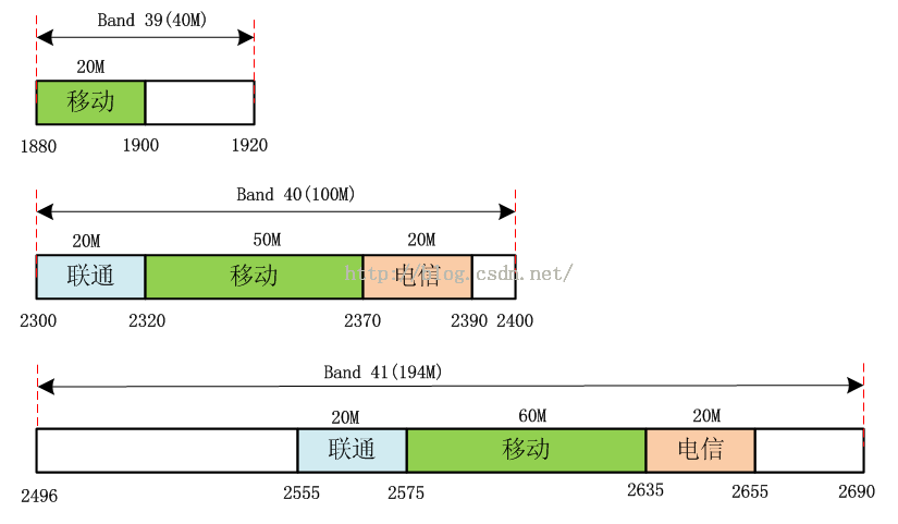 目前中国移动、联通、电信三家运营商使用的频带范围如下表所示。