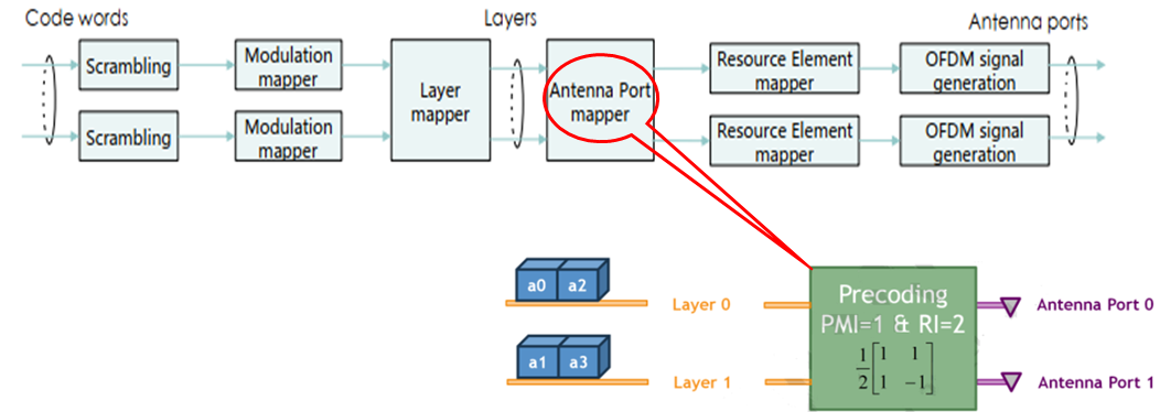 以MIMO的空分复用场景为例,上图中我们看到在Layer Mapping之后就是Antenna Port Mapping,这个mapping过程对应的就是Precoding(预编码):即通过一个预编码矩阵的操作对各个Antenna Port的信号进行相位(Phase)和幅度(Amplitude)的调整,每个port上的信号的相位和幅度不同,那么经历的信道状态就不一样。再结合定义看,定义里我们看到三个重要的词:Sysmbol/Channel/Propagate,而上图进入Antenna Port mapper的就是调制&层映射后的Symbol,因此antenna port主要是物理层预处理过程的概念,是一个逻辑概念,跟物理天线端口不一定一一对应,其主要作用是表征无线信道(Radio Channel)状态,也就是凡是从相同port发出来的数据经历(Propagate)的信道状况都是相同的。