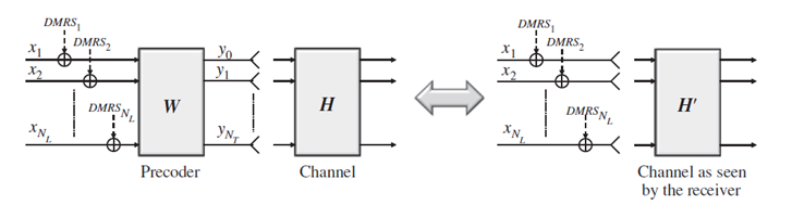 关于NR下行传输方案,38214目前只定义了一种,称为“Transmission scheme 1”。这种方案的一个最大特点就是gNB将数据和DMRS一同预编码,之后通过无线信道,发送给终端。如下图,从终端的角度来看,可以通过DMRS的解调,反推出信道矩阵H’(H’=W*H),然后就可以用这个推导出来的信道矩阵再去解数据,因此预编码矩阵对终端来说是透明的。利用这一原理,不论gNB下行使用什么预编码矩阵,原则上说gNB都无需通知终端,终端也可以成功解出数据。